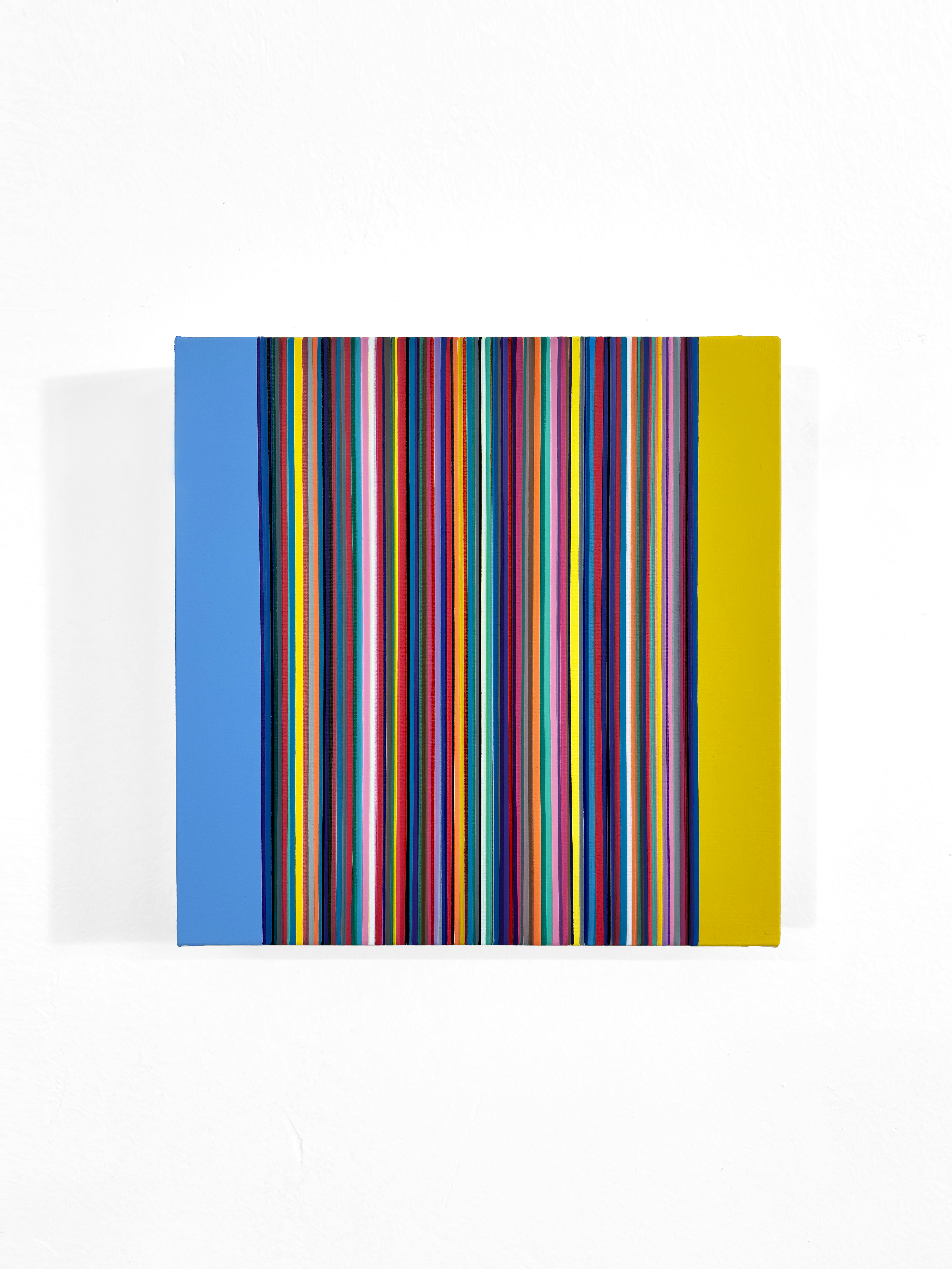 La serie Linee si pone come un’ indagine sulle possibilità espressive della pura successione cromatica e formale, senza concessioni a elementi figurativi o narrativi. La superficie della tela è interamente occupata da una fitta sequenza di linee verticali di larghezza variabile, ma rigorosamente allineate. Non vi è alcuna interruzione del bordo superiore o inferiore. L’ occhio dell’ osservatore è costretto a muoversi in verticale, seguendo il ritmo cromatico senza fine apparente. La disposizione non segue uno schema percepibile di simmetria o gradazione tonale, bensì una scansione apparentemente casuale che, all’analisi, rivela una distribuzione equilibrata di saturazione e luminosità. L’ effetto ottico complessivo è quello di un tessuto policromo nel quale, nonostante la densità visiva, si mantiene una leggibilità simultanea di tutte le bande. Alla visione ravvicinata emergono delicate variazioni nella stesura dell’ olio, questo contrasto microstrutturale introduce un livello tattile che, pur restando subordinato alla regolarità formale, aggiunge profondità al piano pittorico e invita l’ osservatore a una fruizione multisensoriale. La reiterazione delle linee evoca la scansione del tempo come successione di attimi. Ogni striscia diviene un’ unità temporale autonoma ma in relazione alle sue vicine. L’ assenza di un punto focale centrale sposta l’attenzione sul processo e sulla durata della visione, sottolineando la dimensione temporale dell’ atto percettivo. L’ opera richiede un coinvolgimento attivo dello spettatore che, avvicinandosi o allontanandosi modifica continuamente le condizioni di lettura cromatica. A distanza ravvicinata il dettaglio delle texture emerge, mentre da lontano si percepisce un effetto di vibrazione ottica, quasi musicale, dovuto all’alternarsi rapido dei colori.