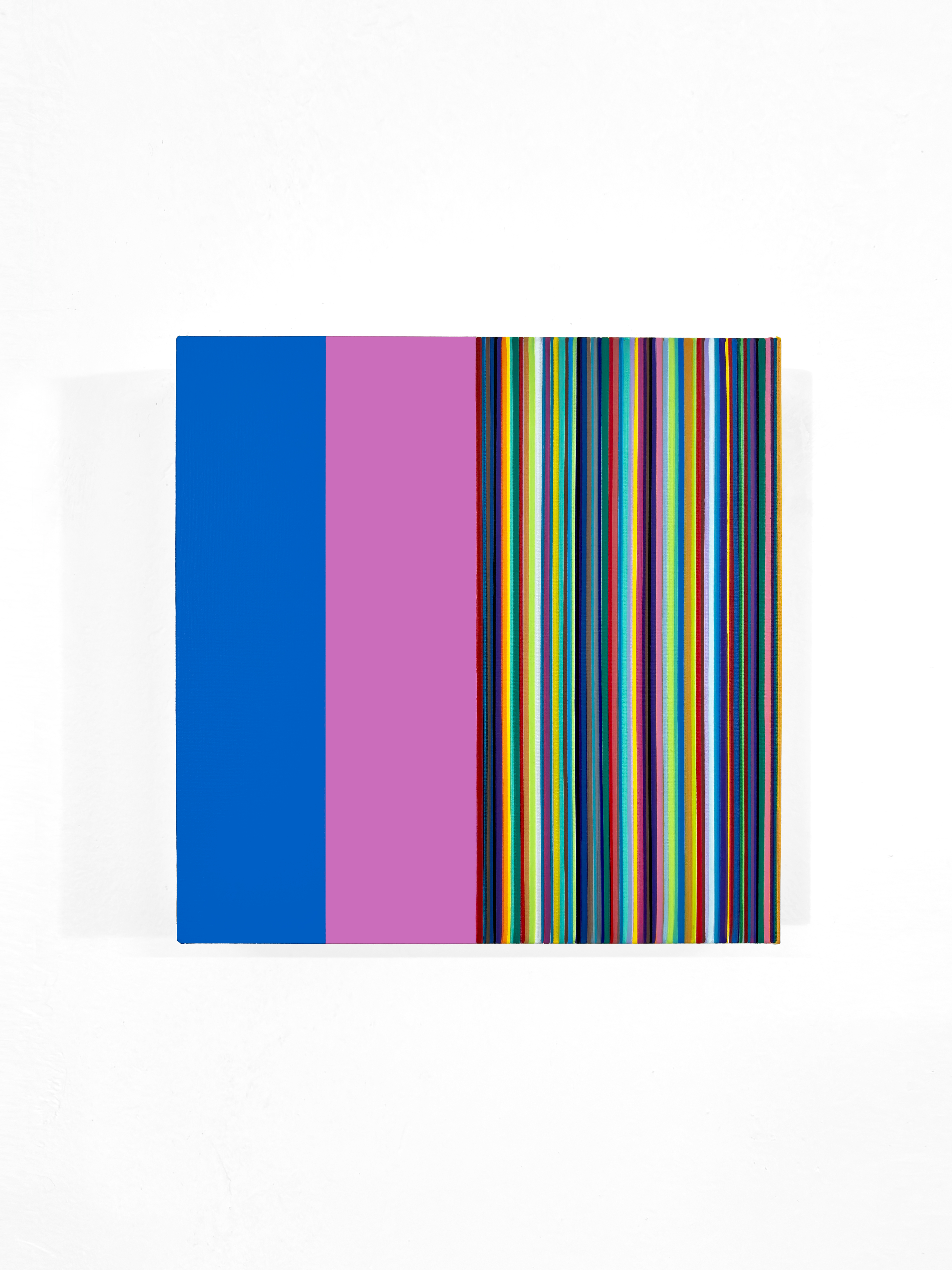 Campo cromatico si presenta come una serie pittorica che esplora la relazione dinamica tra ordine e instabilità attraverso l’uso sistematico della linea verticale, dove il colore assume una funzione quasi strutturale. Non illustra, non rappresenta ma costruisce un sistema spaziale autonomo. Un dialogo tra il campo centrale dei cromatismi verticali e le campiture laterali, più ampie e monocrome. La loro presenza non è neutra. Esse influenzano la lettura del ritmo cromatico spostandone il baricentro percettivo e attivando una condizione di oscillazione tra equilibrio e asimmetria. Il rapporto tra monocromia e policromia diventa così un principio interno di variazione, quasi una partitura che cambia tono e densità a seconda della relazione tra i colori.