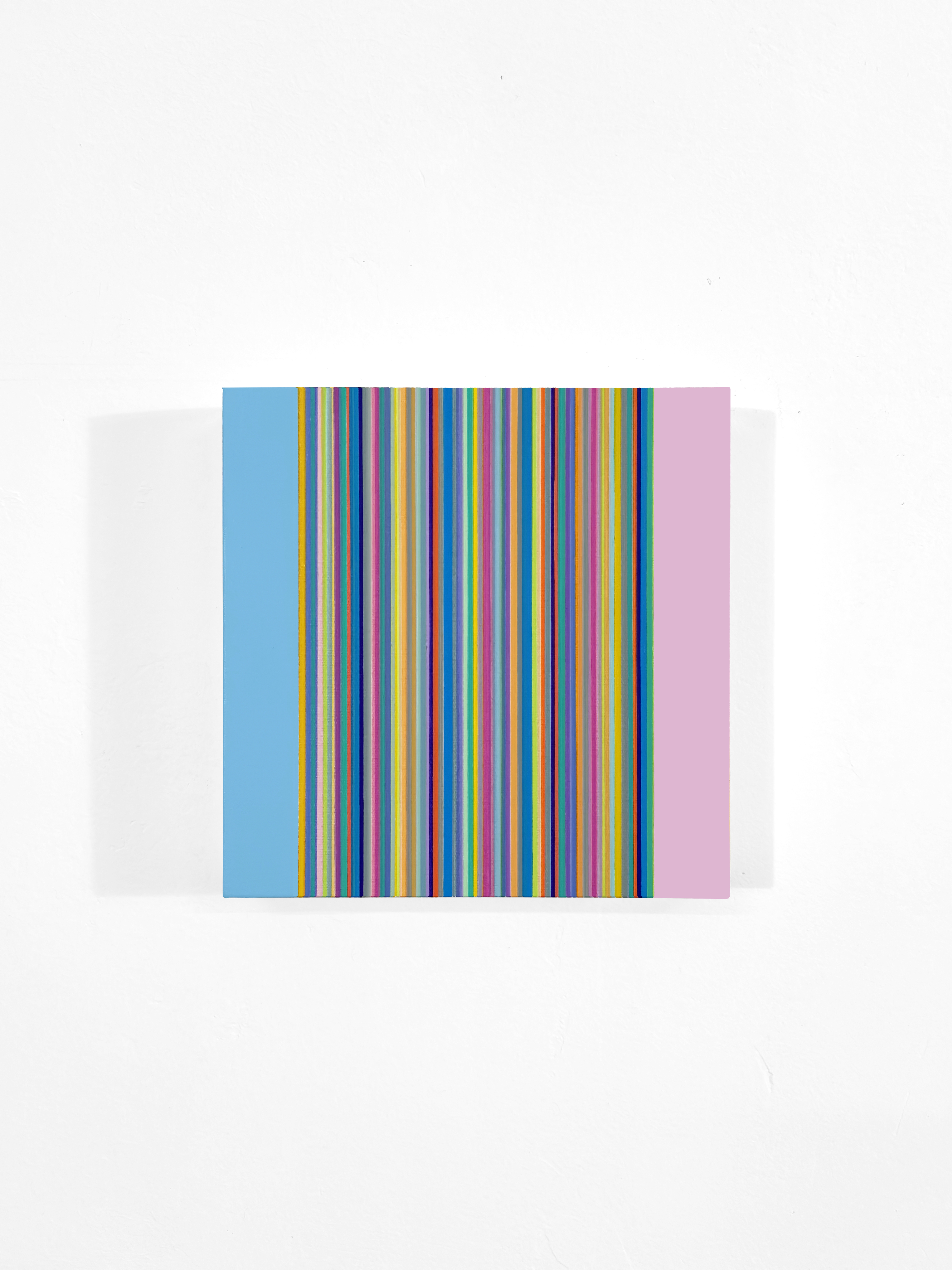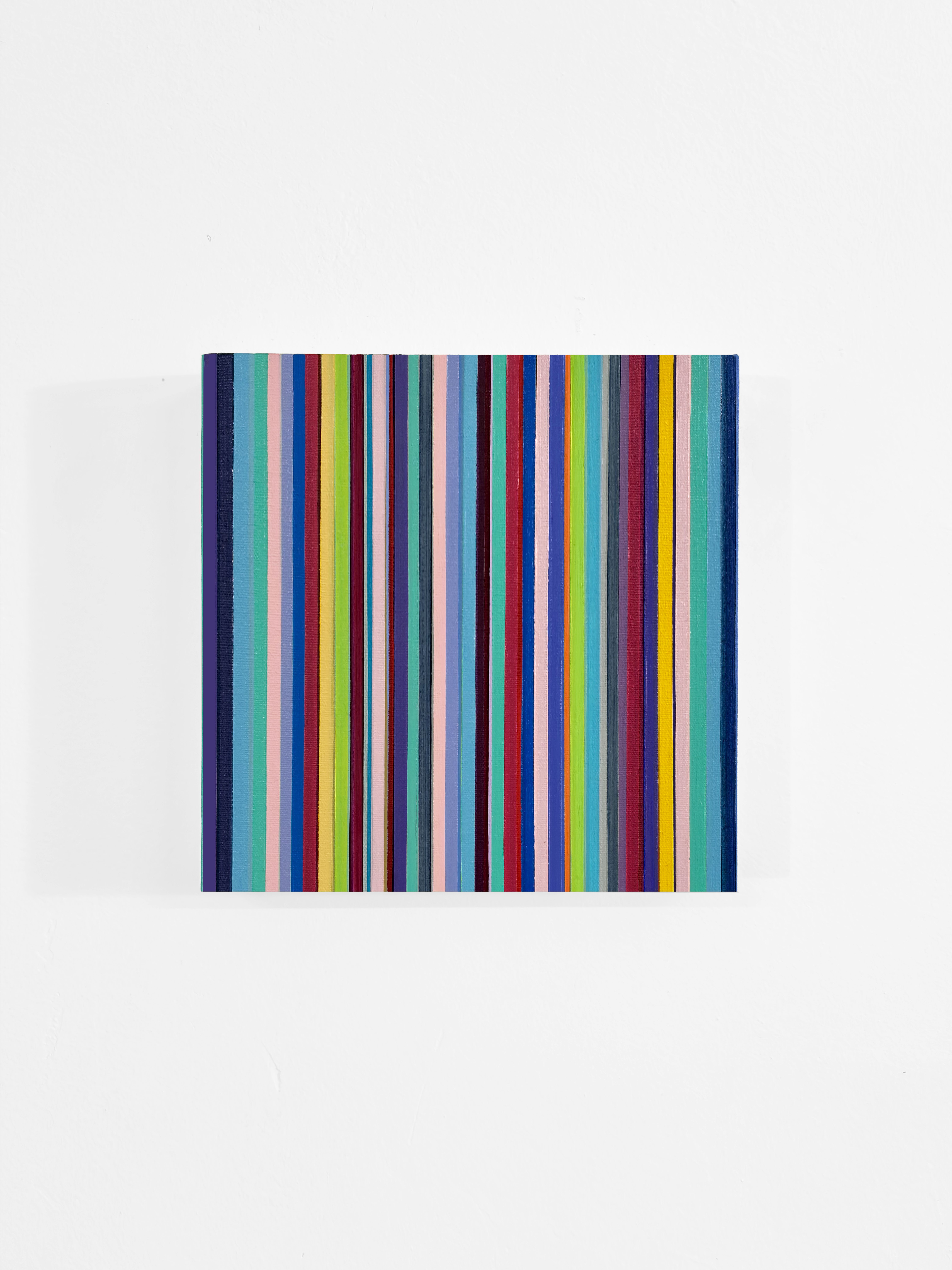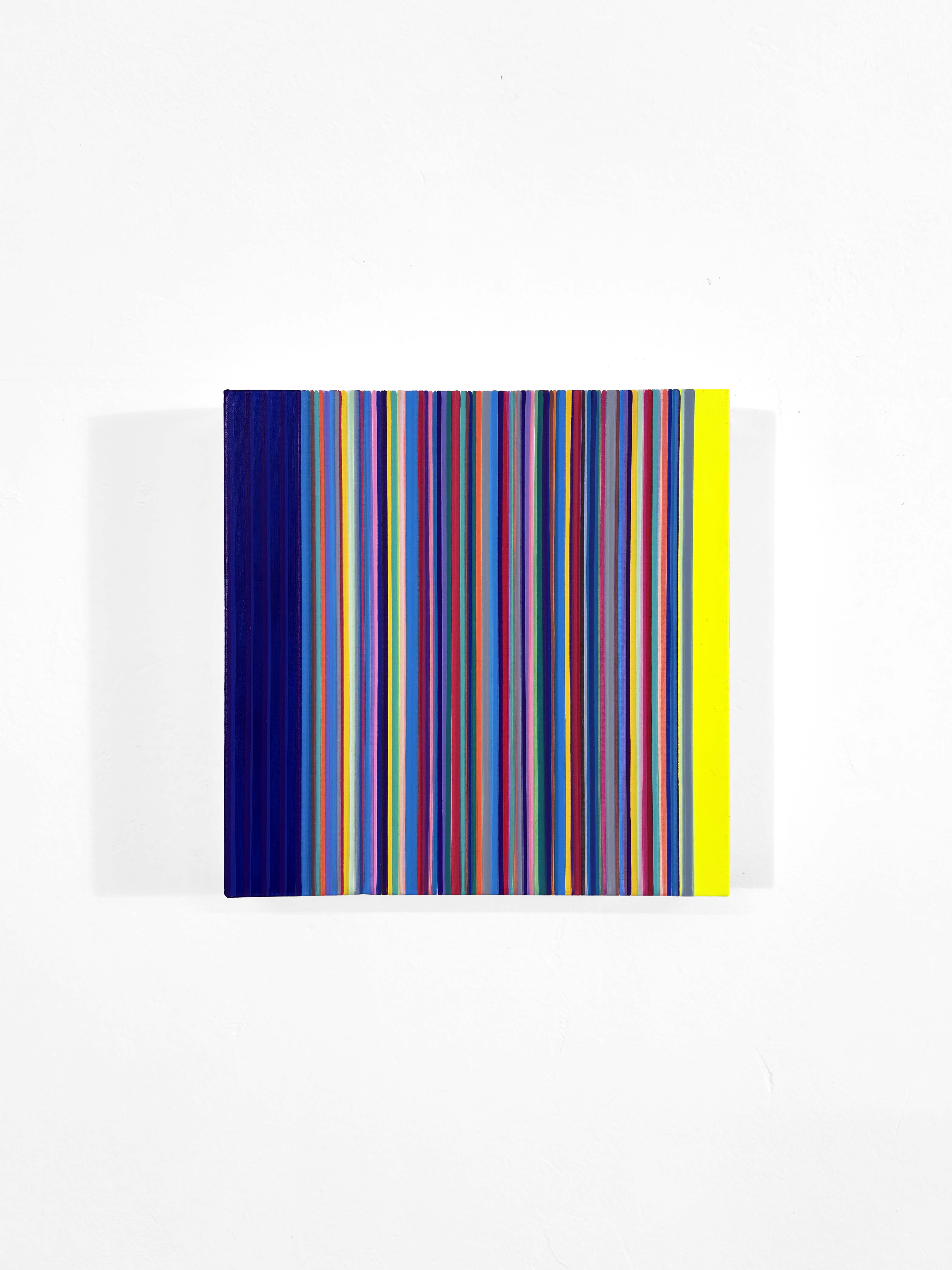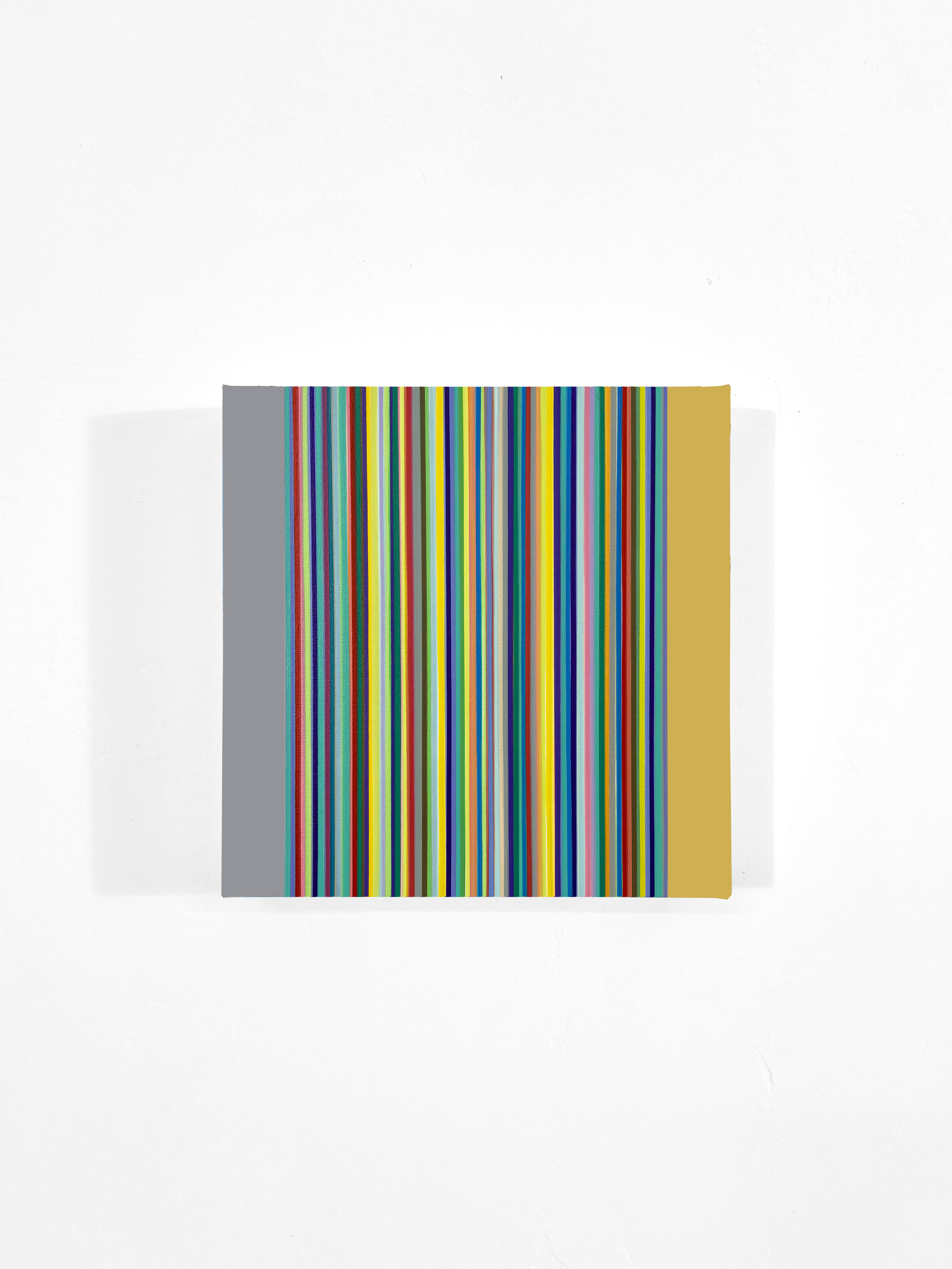 La serie Linee si pone come un’ indagine sulle possibilità espressive della pura successione cromatica e formale, senza concessioni a elementi figurativi o narrativi. La superficie della tela è interamente occupata da una fitta sequenza di linee verticali di larghezza variabile, ma rigorosamente allineate. Non vi è alcuna interruzione del bordo superiore o inferiore. L’ occhio dell’ osservatore è costretto a muoversi in verticale, seguendo il ritmo cromatico senza fine apparente. La disposizione non segue uno schema percepibile di simmetria o gradazione tonale, bensì una scansione apparentemente casuale che, all’analisi, rivela una distribuzione equilibrata di saturazione e luminosità. L’ effetto ottico complessivo è quello di un tessuto policromo nel quale, nonostante la densità visiva, si mantiene una leggibilità simultanea di tutte le bande. Alla visione ravvicinata emergono delicate variazioni nella stesura dell’ olio, questo contrasto microstrutturale introduce un livello tattile che, pur restando subordinato alla regolarità formale, aggiunge profondità al piano pittorico e invita l’ osservatore a una fruizione multisensoriale. La reiterazione delle linee evoca la scansione del tempo come successione di attimi. Ogni striscia diviene un’ unità temporale autonoma ma in relazione alle sue vicine. L’ assenza di un punto focale centrale sposta l’attenzione sul processo e sulla durata della visione, sottolineando la dimensione temporale dell’ atto percettivo. L’ opera richiede un coinvolgimento attivo dello spettatore che, avvicinandosi o allontanandosi modifica continuamente le condizioni di lettura cromatica. A distanza ravvicinata il dettaglio delle texture emerge, mentre da lontano si percepisce un effetto di vibrazione ottica, quasi musicale, dovuto all’alternarsi rapido dei colori.