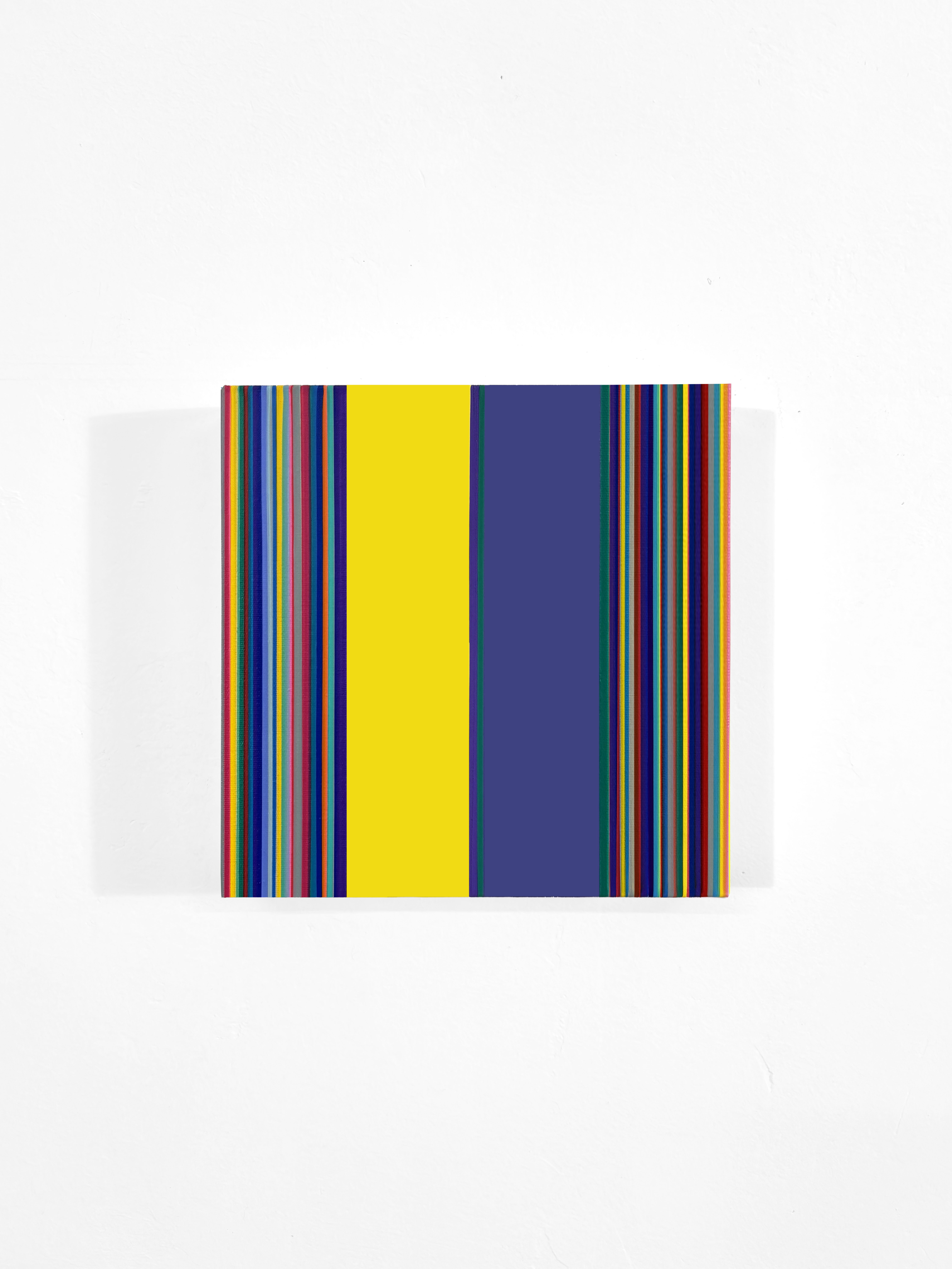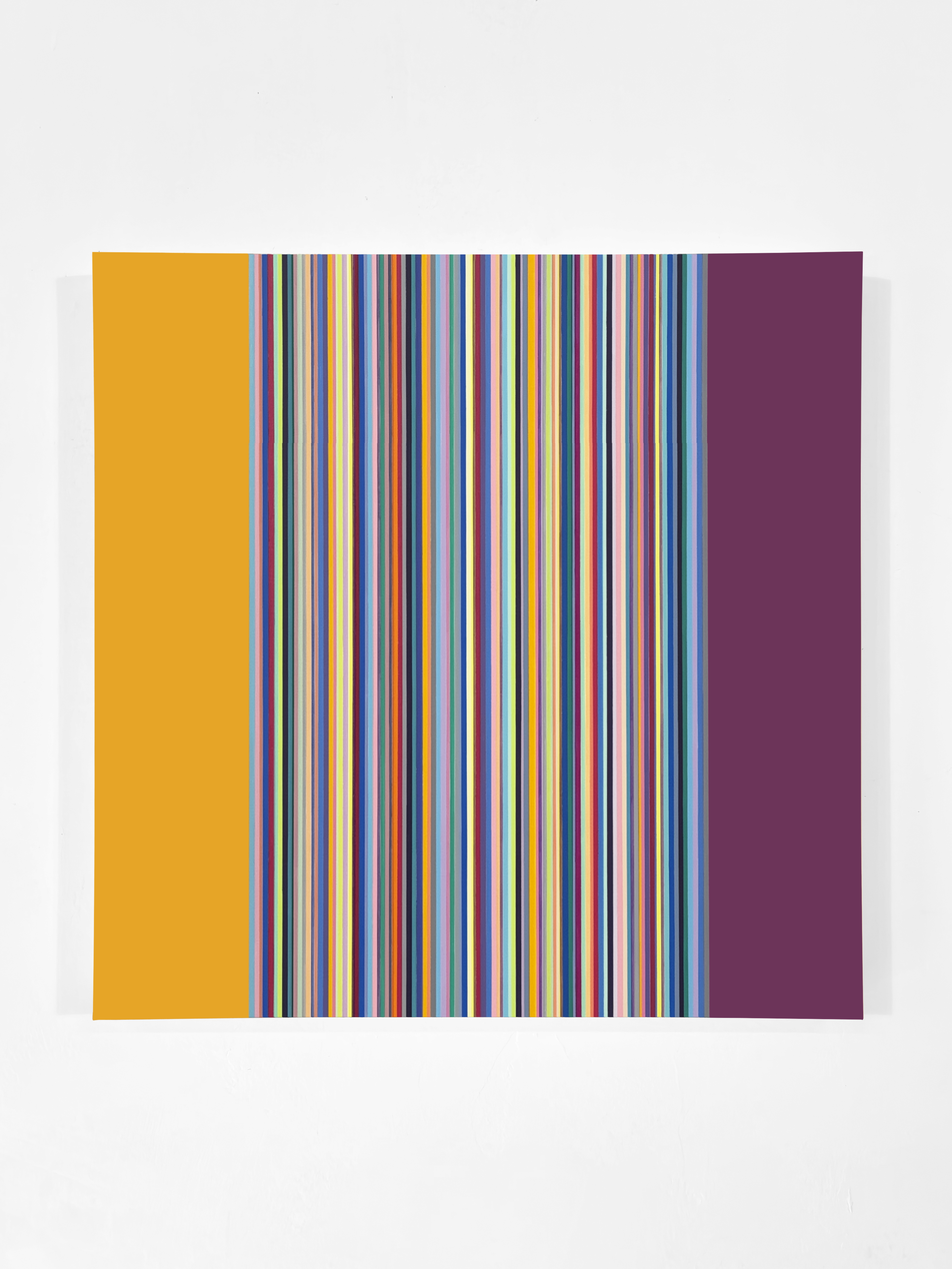 Campo cromatico si presenta come una serie pittorica che esplora la relazione dinamica tra ordine e instabilità attraverso l’uso sistematico della linea verticale, dove il colore assume una funzione quasi strutturale. Non illustra, non rappresenta ma costruisce un sistema spaziale autonomo. Un dialogo tra il campo centrale dei cromatismi verticali e le campiture laterali, più ampie e monocrome. La loro presenza non è neutra. Esse influenzano la lettura del ritmo cromatico spostandone il baricentro percettivo e attivando una condizione di oscillazione tra equilibrio e asimmetria. Il rapporto tra monocromia e policromia diventa così un principio interno di variazione, quasi una partitura che cambia tono e densità a seconda della relazione tra i colori.